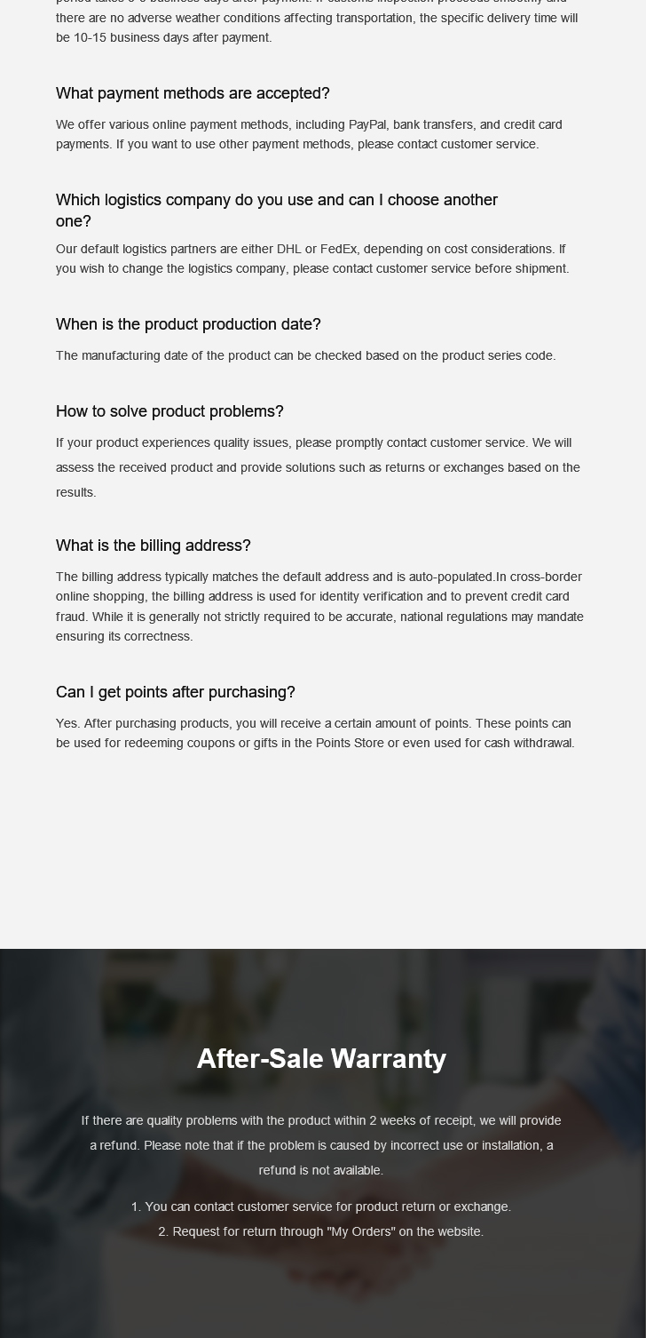 Payment and Order Processing:We support a variety of mainstream payment methods (e.g., Visa, PayPal, TT). Our checkout process is quick and secure, with orders processed within the same day.